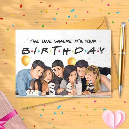 Friends Birthday Card - The One Where It's Your Birthday, Phoebe, Ross, Chandler, Monica, 90s, Sitcom, Joey, Rachel [00891]