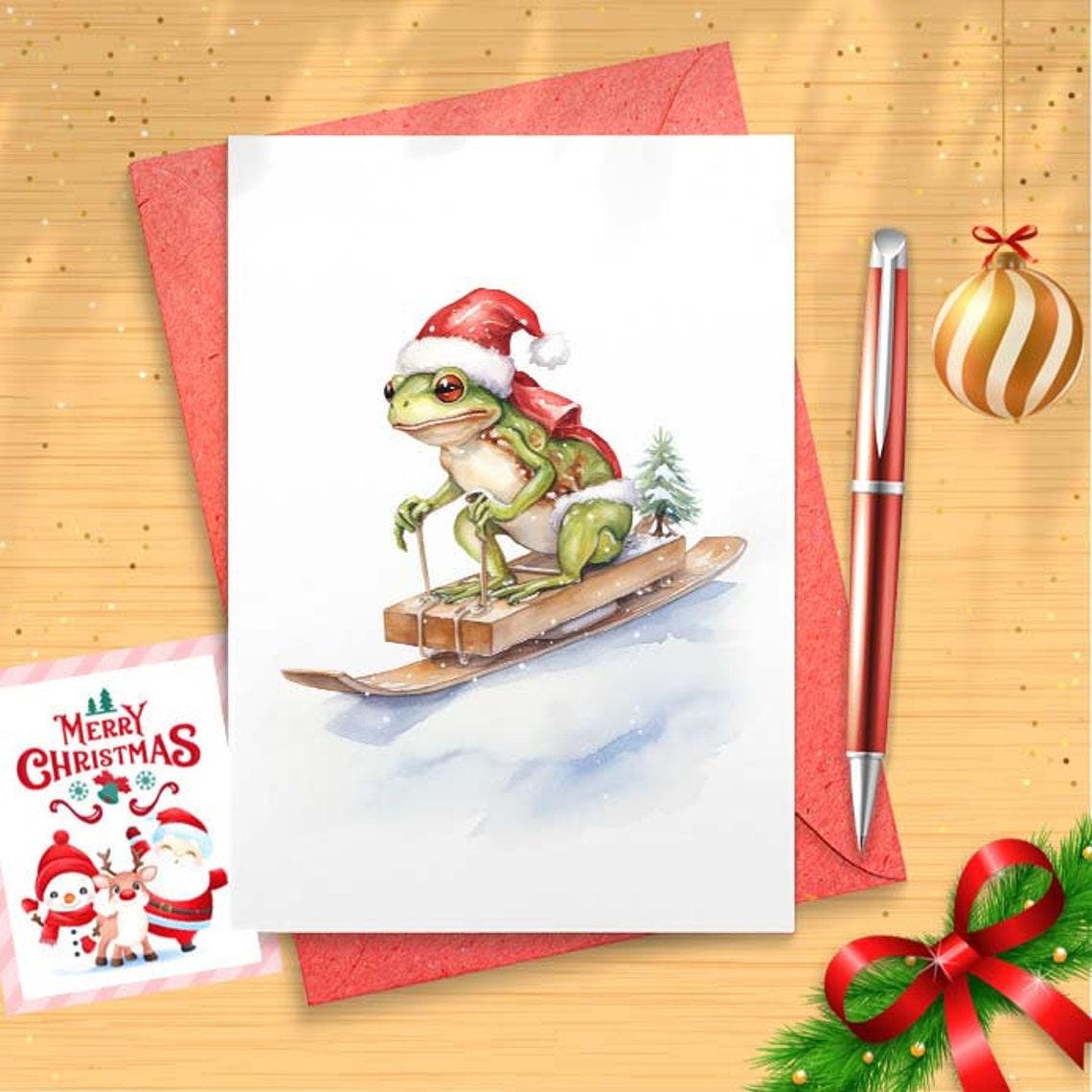 Sledding Frog Christmas Card Set Barred Rock on Sled w/ Santa Hat Funny Cute Holiday [CR]