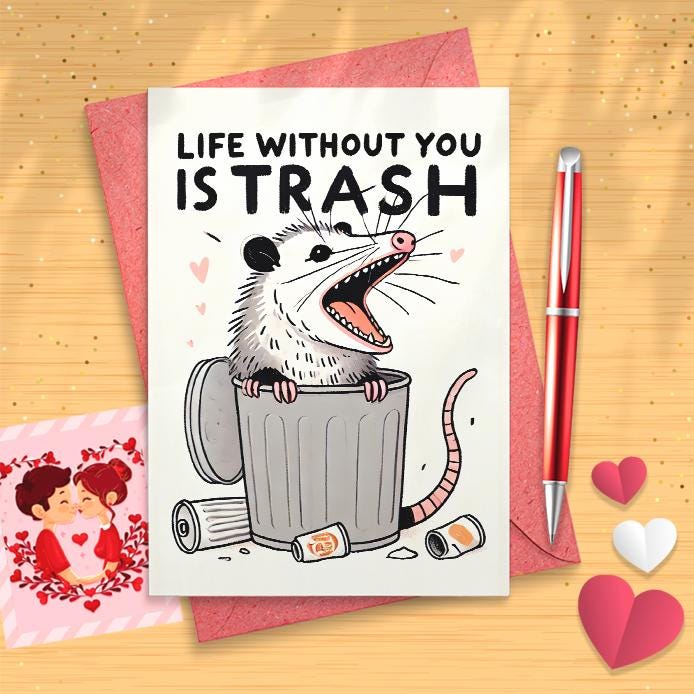 Life Without You Is Trash - Funny Possum Valentine's Card for Couples, Romantic Pun Card for Anniversary or Love [03277]
