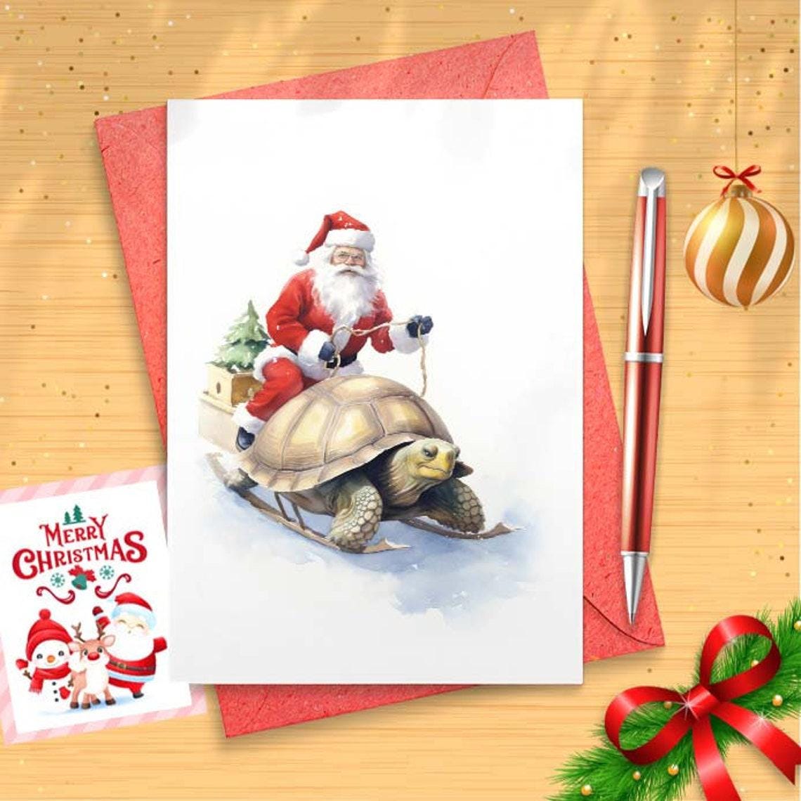Sledding Santa with Tortoise Christmas Card Set Barred Rock on Sled w/ Santa Hat Funny Cute Holiday [CR]