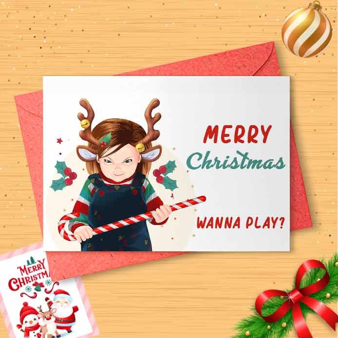 Creepy 'Wanna play?' Christmas Card, 1980s Vintage, Scary Movie, Pop Art, Hand-drawn Christmas Cards, Slasher Movies, Horror [00488]