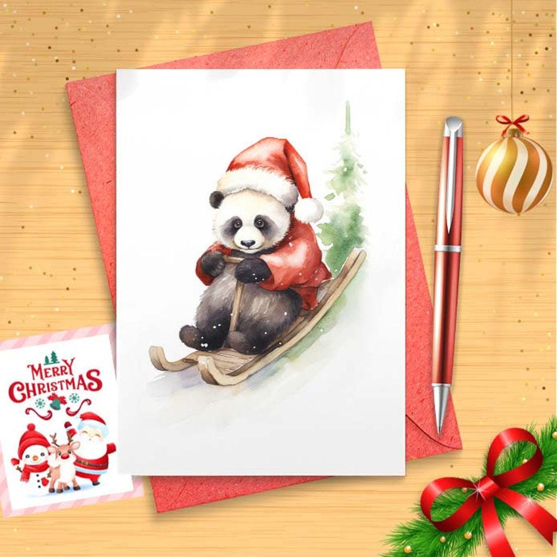 Sledding Panda Christmas Card Set Barred Rock on Sled w/ Santa Hat Funny Cute Holiday [CR]