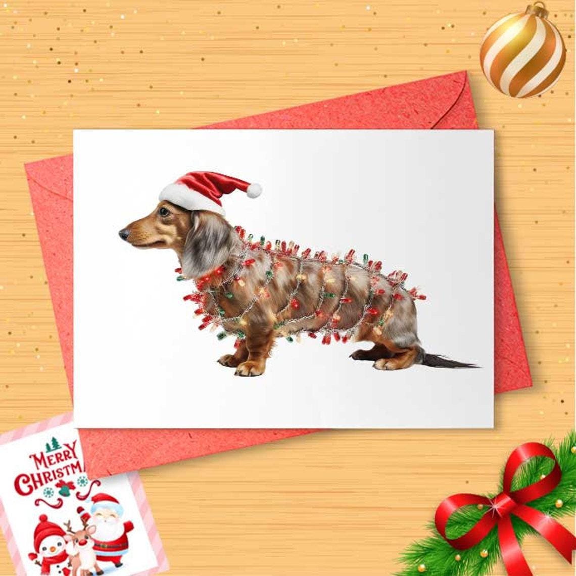 Dachshund with Christmas lights, Santa hat - Cute Christmas Card, Funny Christmas Card, Holiday Card, dog, puppy, dachshund card [CR]