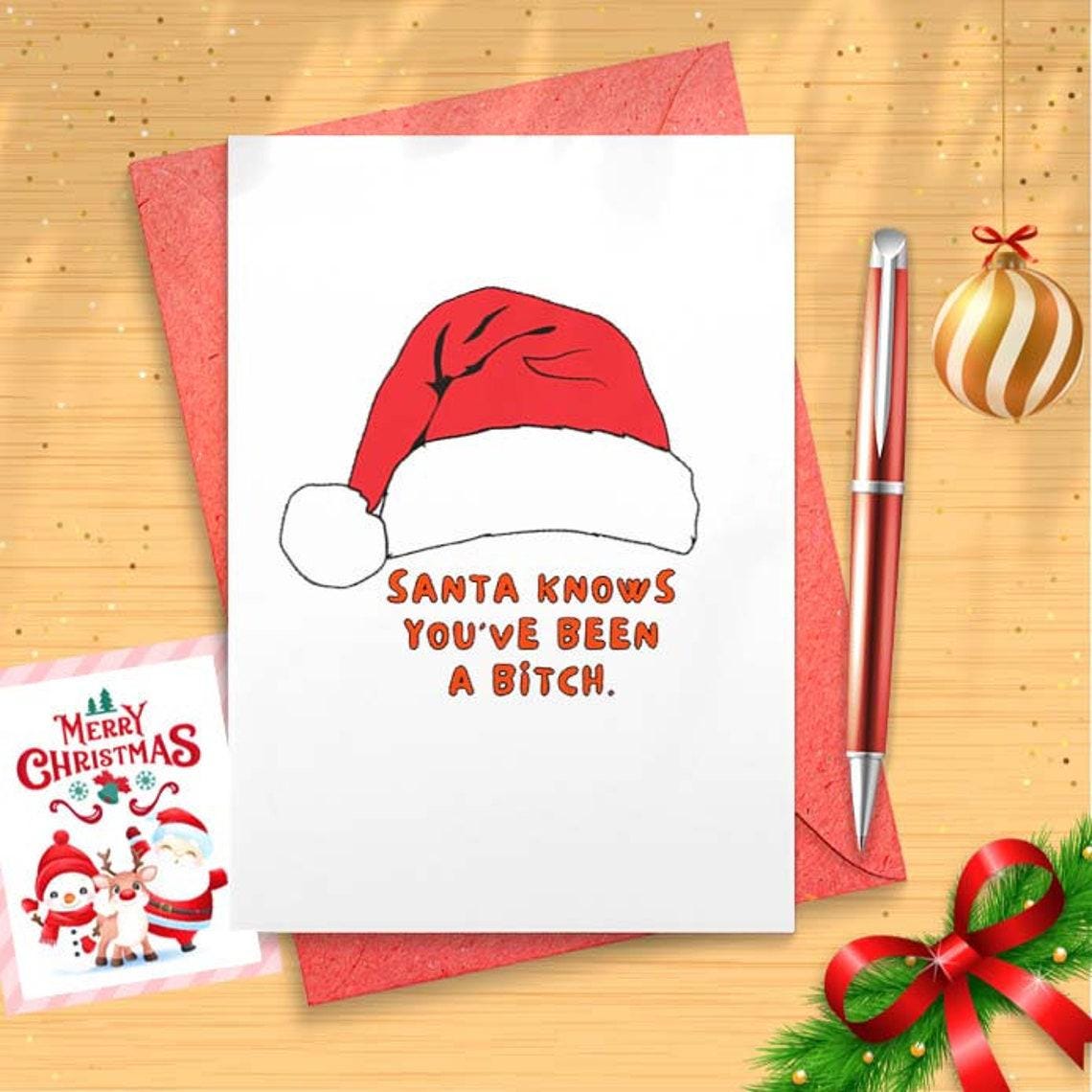 Funny Christmas Card For Her / Santa Knows You've Been A Bitch / Adult Christmas / Santa Card / Christmas Gift Basket / Holiday [CR]