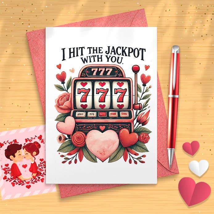 Pun Love Card - 'I Hit the Jackpot with You' - Cute Valentine's Day or Anniversary Card - Funny Romantic Greeting for Him or Her [03309]